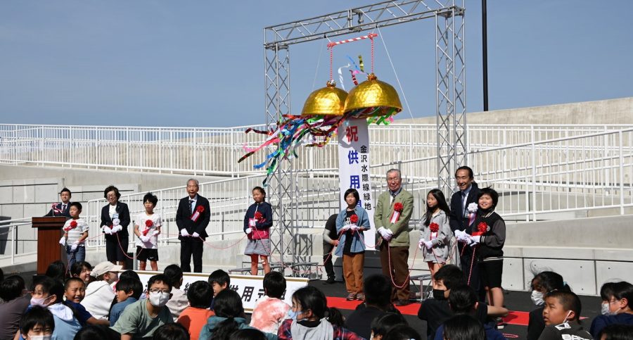 午後2時からセレモニーが開始され、永井京子金沢区長から「金沢水際線緑地」の供用開始にあたり「前は広い海、金沢区らしい景色が見られ、新しい名所になるでしょう」とご挨拶がありました。来賓者のご紹介がされた後、横浜市立並木第四小学校の児童と永井金沢区長、中野港湾局長、来賓者によるくす玉割りが行われました。